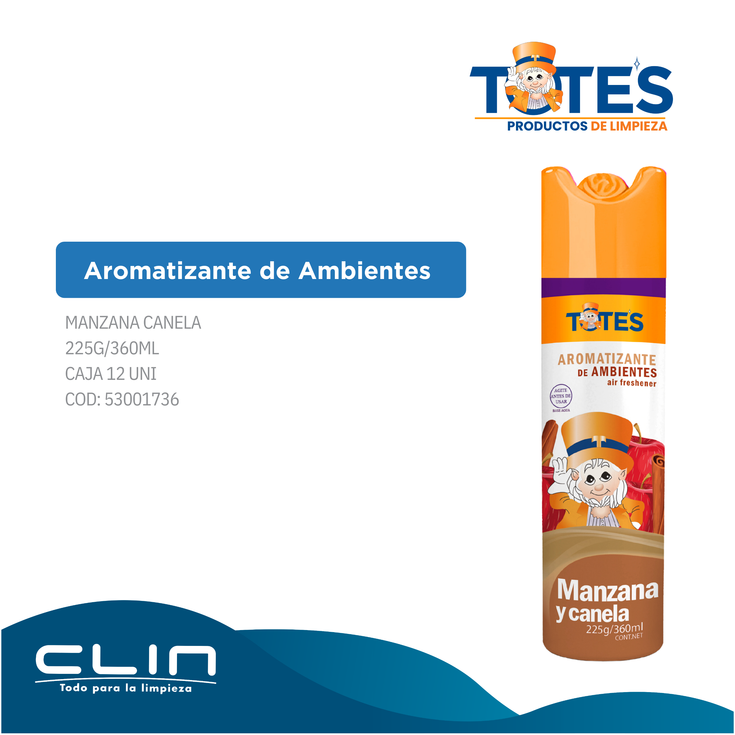 Transforma tus espacios con el aromatizante Totes, diseñado para ofrecer frescura duradera y un ambiente agradable. Con su contenido neto de 225g/360ml, es perfecto para eliminar olores y mantener tu hogar, oficina o auto siempre perfumados. Ideal para quienes buscan calidad y bienestar en cada rincón.